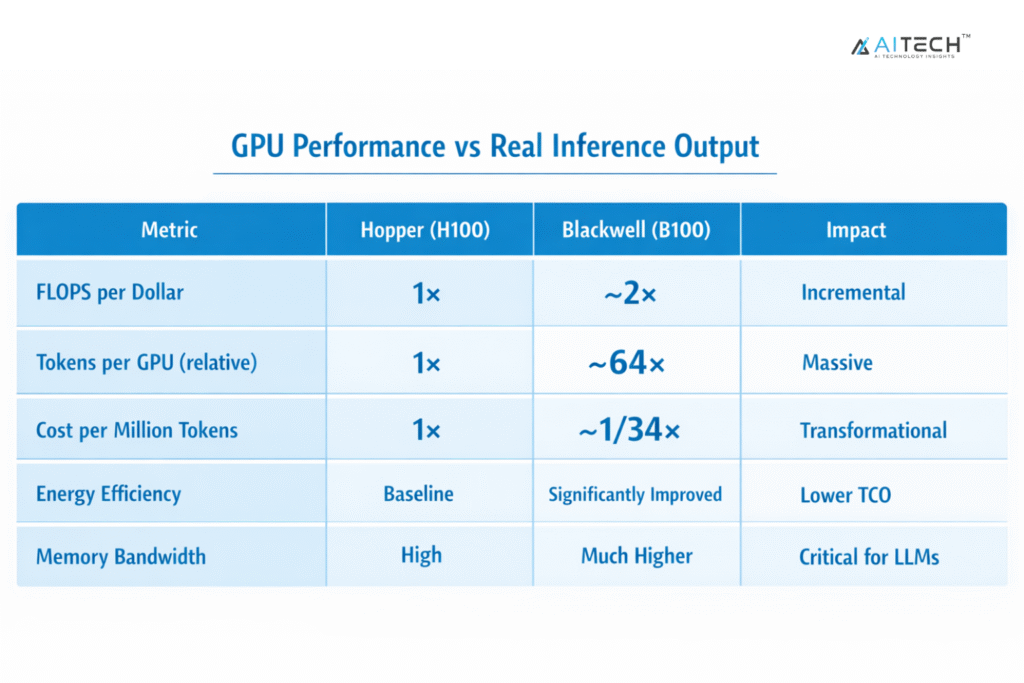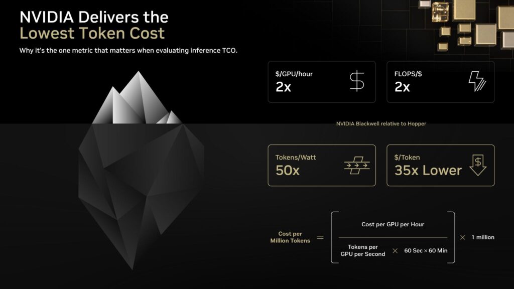 According to NVIDIA’s latest data, Blackwell delivers nearly 2× higher FLOPS per dollar than Hopper. However, more importantly it achieves 34× lower cost per million tokens and up to 64× higher token output per GPU